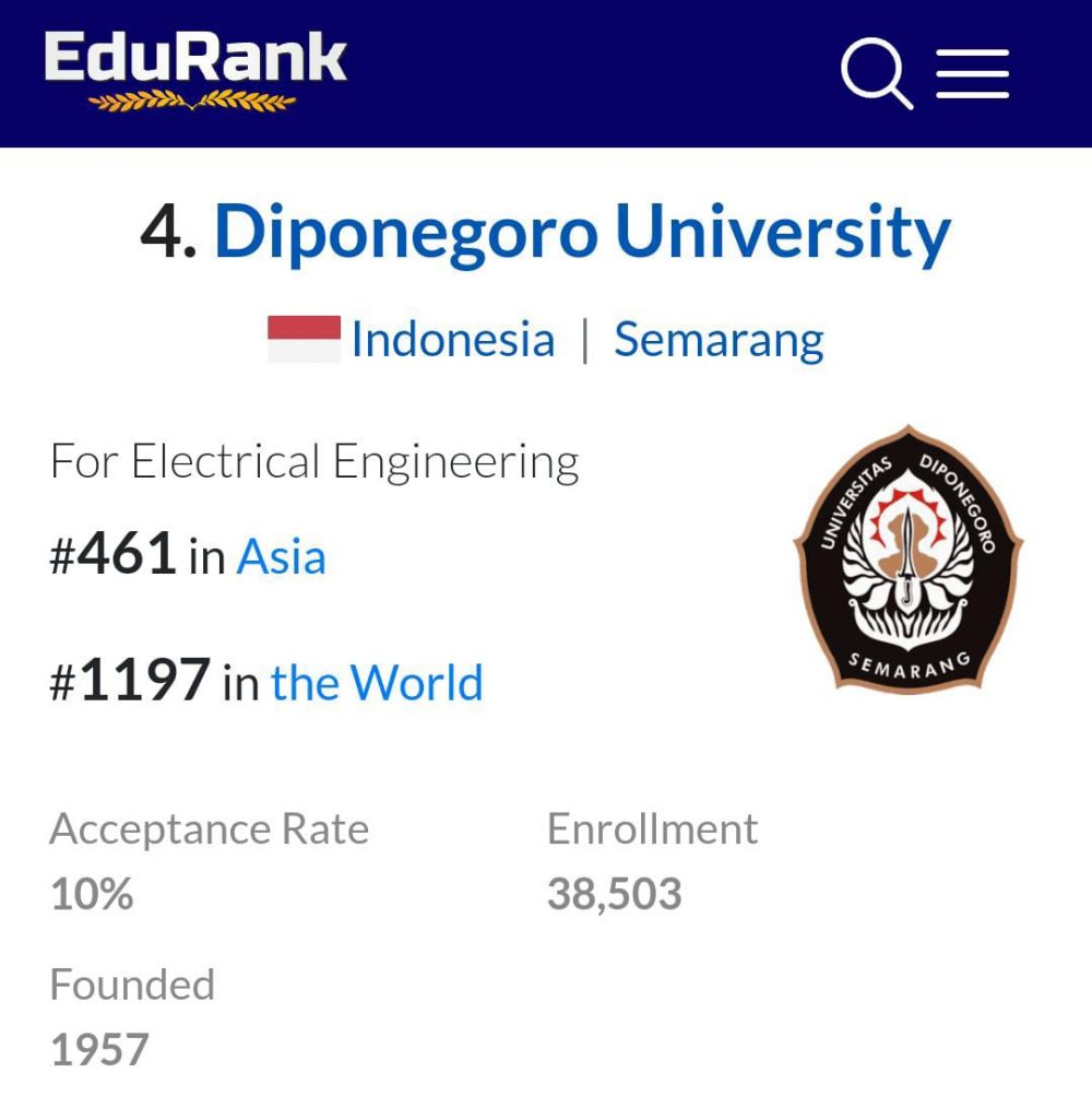 Another brilliant achievement achieved is the Diponegoro University Electrical Engineering study program which is ranked 4th in Indonesia according to EduRank. This ranking is proof of the high quality of education and dedication in the field of electrical engineering that continues to be improved by the UNDIP electrical engineering undergraduate program.