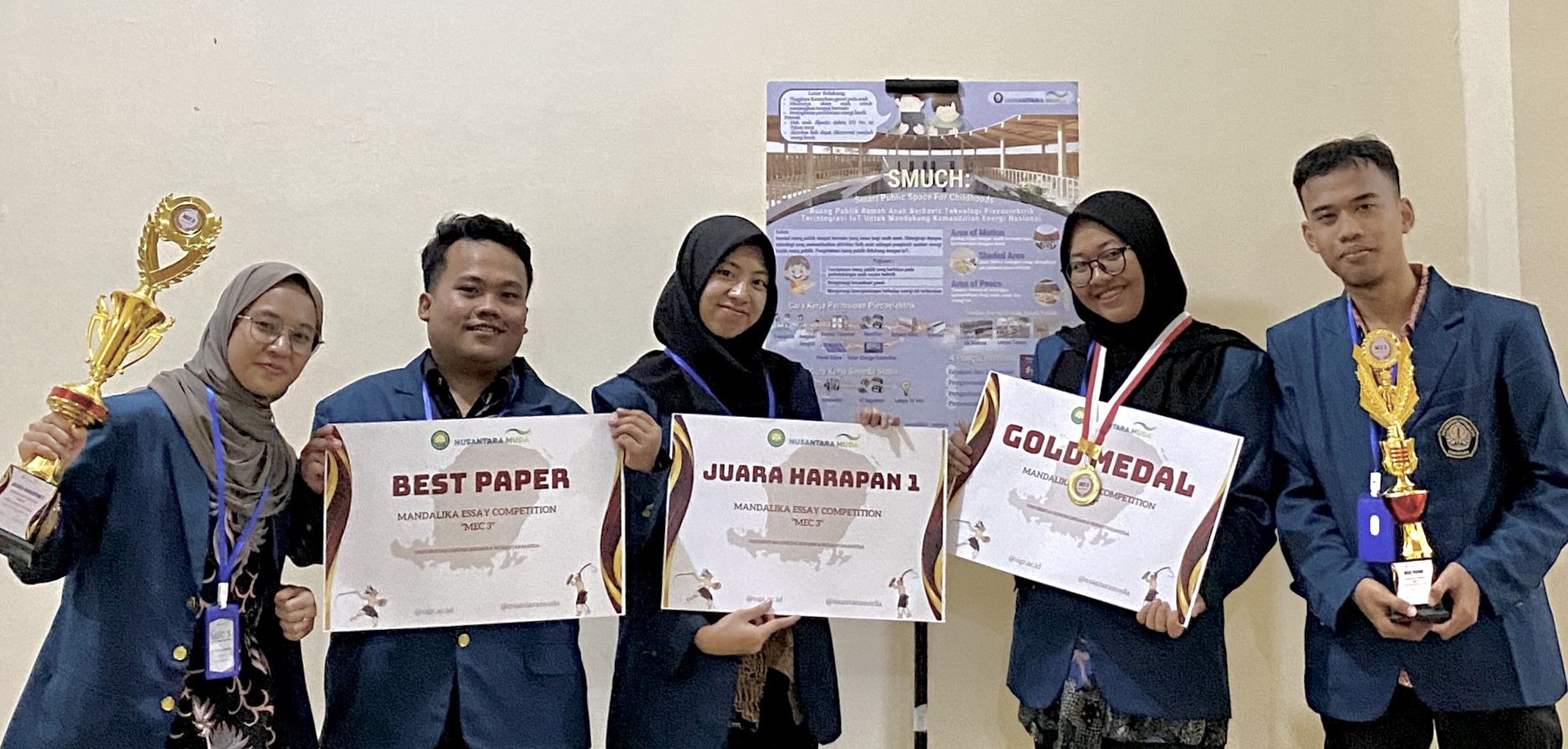 Tim ini mengambil judul esai yang menarik, yaitu “SMUCH: Smart Public Space For Childhoods – Ruang Publik Ramah Anak Berbasis Teknologi Piezoelektrik Terintegrasi IoT untuk Mendukung Kemandirian Energi Nasional.” Esai ini mengusung konsep pengembangan ruang publik yang ramah anak dan bertujuan memberikan pengaruh positif pada perkembangan anak-anak. Selain itu, esai ini juga menyoroti masalah peningkatan penggunaan gawai pada anak-anak dan kontribusi terhadap peningkatan konsumsi energi. Esai tersebut memenangkan 3 penghargaan, yaitu Gold medal kategori energi dan teknologi, Best paper kategori umum Mandalika Essay Competition 3, Juara Harapan 1 Kategori umum Mandalika Essay Competition 3.