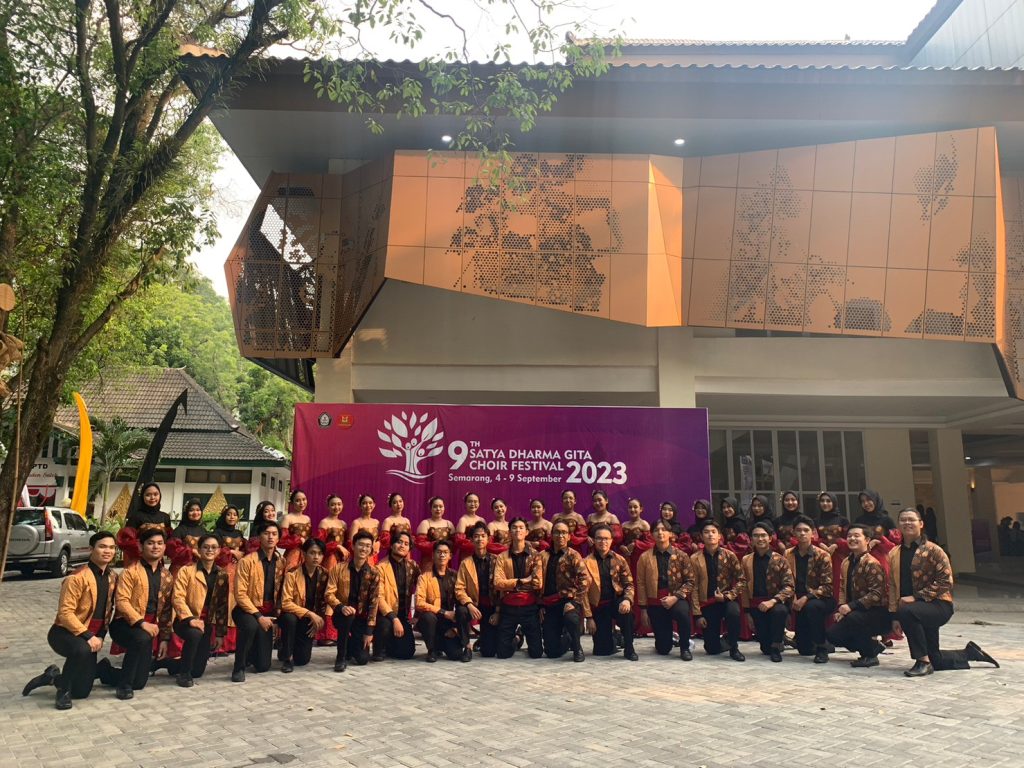 Furthermore, Undip PSMT also performed stunningly in the Satya Dharma Gita Choir Festival (SDGCF) which took place on September 4 to 9, 2023. In this national competition, they won the award as 2nd Winner SDGCF 2023. They also won the first gold medal as 1st Runner Up Gold A with a score of 87.07 in the Music Religion category and the second gold medal as 2nd Runner Up Gold A with a score of 86.74 in the Folklore category. In addition, they won a gold medal in the Mixed Choir category with a score of 81.61.