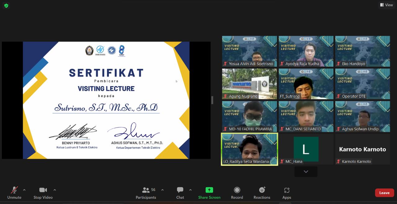 On March 28 2023, an online Visiting Lecture was held by presenting expert speakers in the field of Artificial Intelligence (AI) Biomedical Engineering Sebelas Maret University Sutrisno, S.T., M.Sc., Ph.D. The theme of this Visiting Lecture is “Getting to Know the Biomedical Engineering Artificial Intelligence (AI) Technology Closer. This event was attended by 85 participants, consisting of students and lecturers of Electrical Engineering at Diponegoro University, as well as many other participants from different agencies.