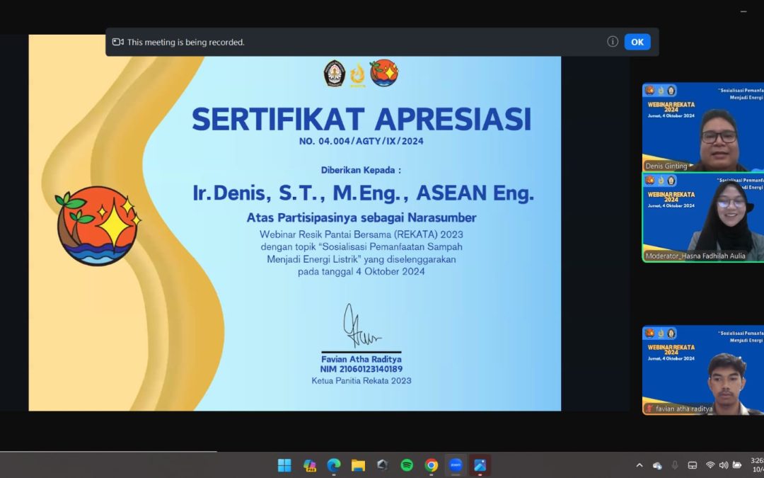 Mahasiswa Teknik Elektro Universitas Diponegoro (Undip) angkatan 2023 sukses menggelar webinar bertajuk “Sosialisasi Pemanfaatan Sampah Menjadi Energi Listrik” pada 4 Oktober 2024. Acara yang diadakan secara daring melalui Zoom ini diikuti oleh 153 peserta, termasuk masyarakat umum yang turut antusias terhadap topik yang diangkat.